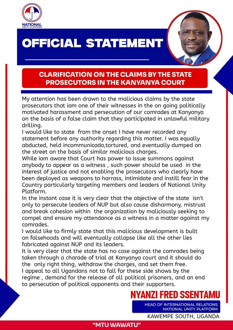 National Unity Platform (NUP) leader Fred Nyanzi Ssentamu, also known as Chairman Nyanzi, has broken his silence after reports emerged that state prosecutors had listed him among witnesses in the controversial Kanyanya unlawful military drilling case involving NUP supporters.