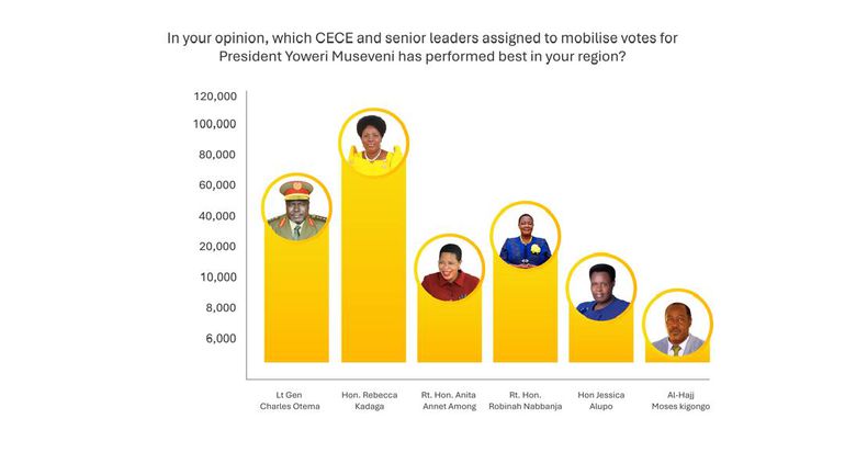 According to the chart, which captures respondents’ views on who delivered the strongest mobilisation results in their respective areas, Kadaga leads by a wide margin. Her score stands significantly higher than those of other Central Executive Committee (CEC) members and senior leaders included in the assessment.