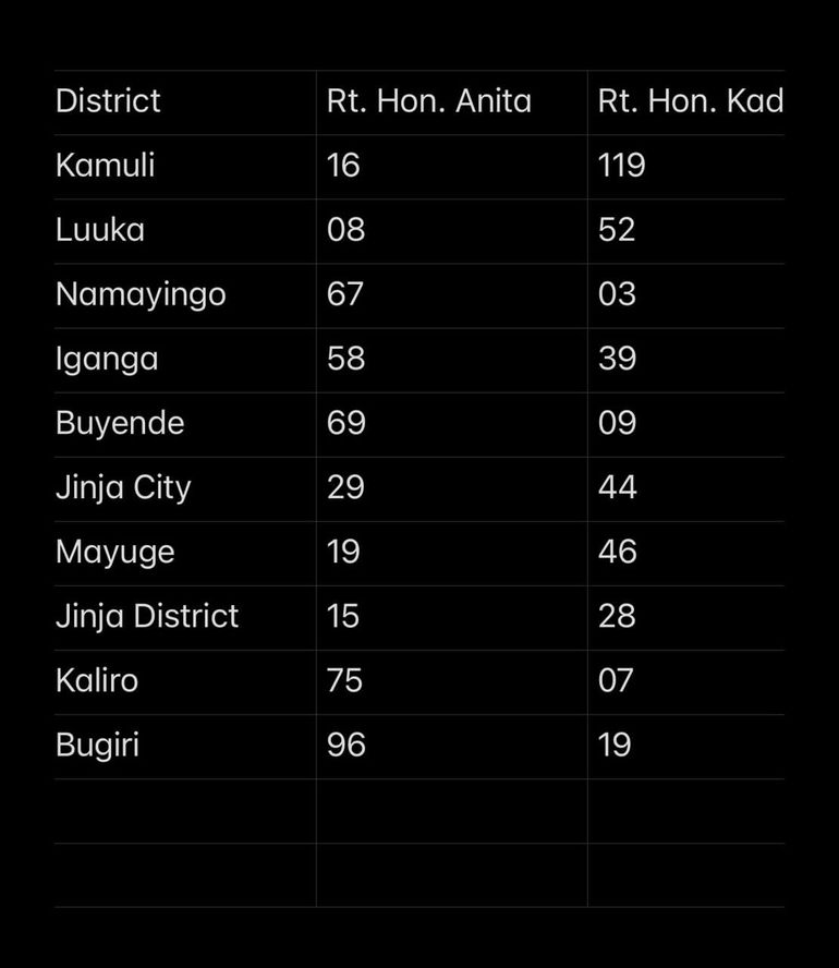 Overall, Anita Among dominated across Busoga, winning in seven out of ten districts, while Kadaga managed victories in only three.