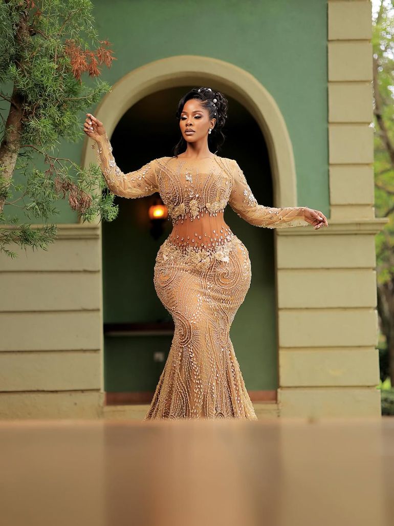 Desire Luzinda showcased distinct yet equally breathtaking looks. For her first dress, she wore a heavily embellished, floor-length gown in a champagne-toned fabric.