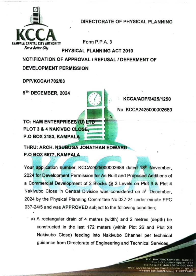 Official records presented during the session revealed that Ham Enterprises (U) Ltd., Kiggundu’s company, had submitted all necessary construction plans, which were lawfully approved by KCCA on 9 December 2024.