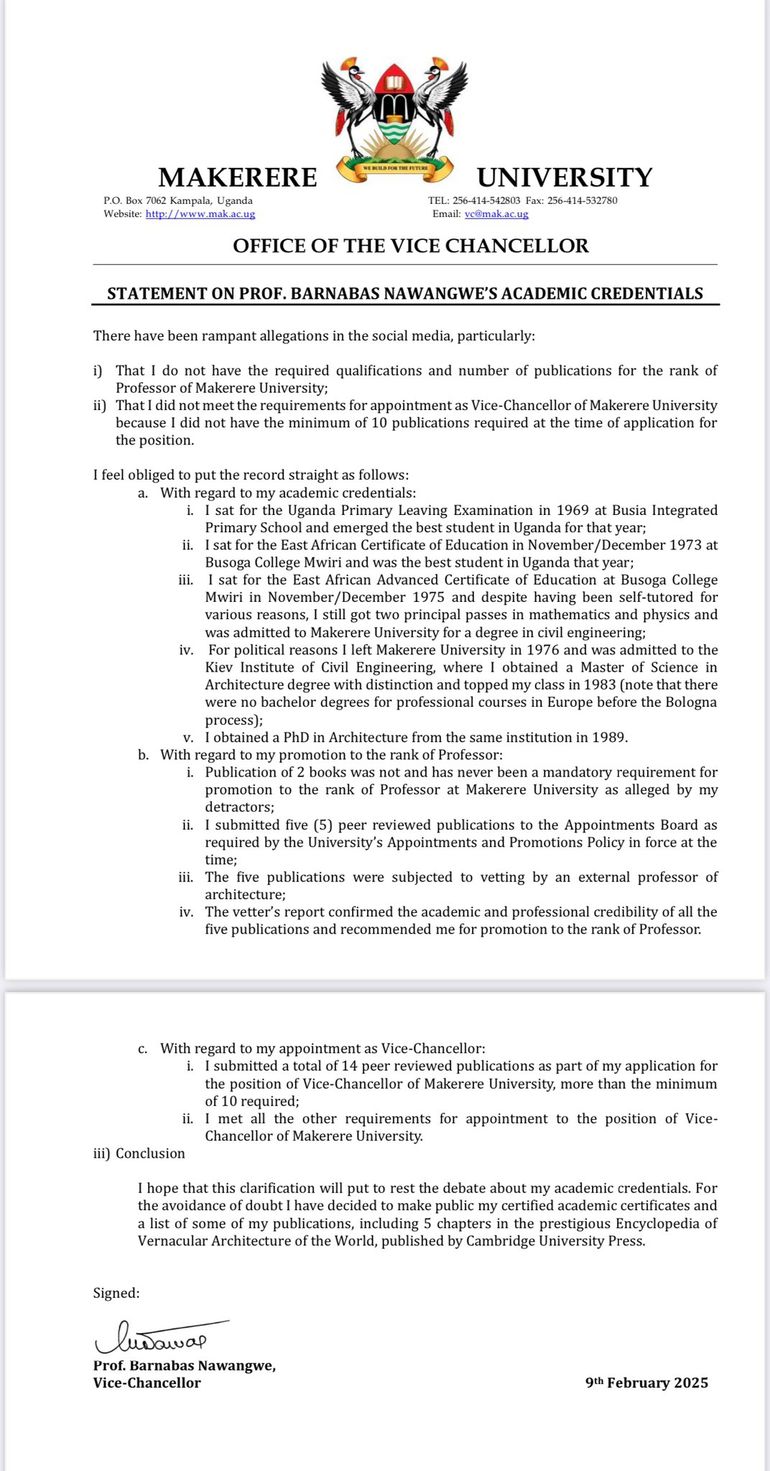 His decision to share his academic credentials followed widespread allegations that he lacked the required number of peer-reviewed publications to qualify as a Professor and Vice-Chancellor of Makerere University. In response, he clarified that he had submitted five peer-reviewed publications for his promotion to Professor, which were externally vetted and deemed credible.