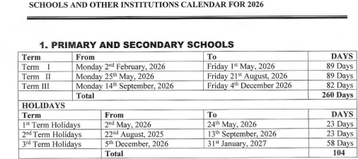 The Ministry of Education and Sports has released the official schools and other institutions calendar for 2026, outlining term dates, holidays, national school activities and compliance guidelines for all government and private institutions.