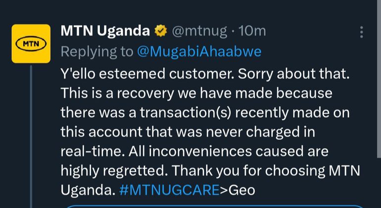 "Y'ello esteemed customer. Sorry about that. This is a recovery we have made because there was a transaction(s) recently made on this account that was never charged in real-time. All inconveniences caused are highly regretted. Thank you for choosing MTN Uganda. #MTNUGCARE>Geo"