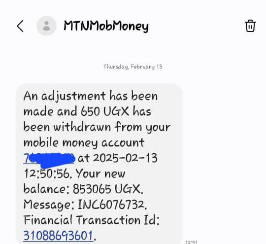 The message received by affected customers from MTN Mobile Money stated: "An adjustment has been made and 150 UGX has been withdrawn from your mobile money account..."