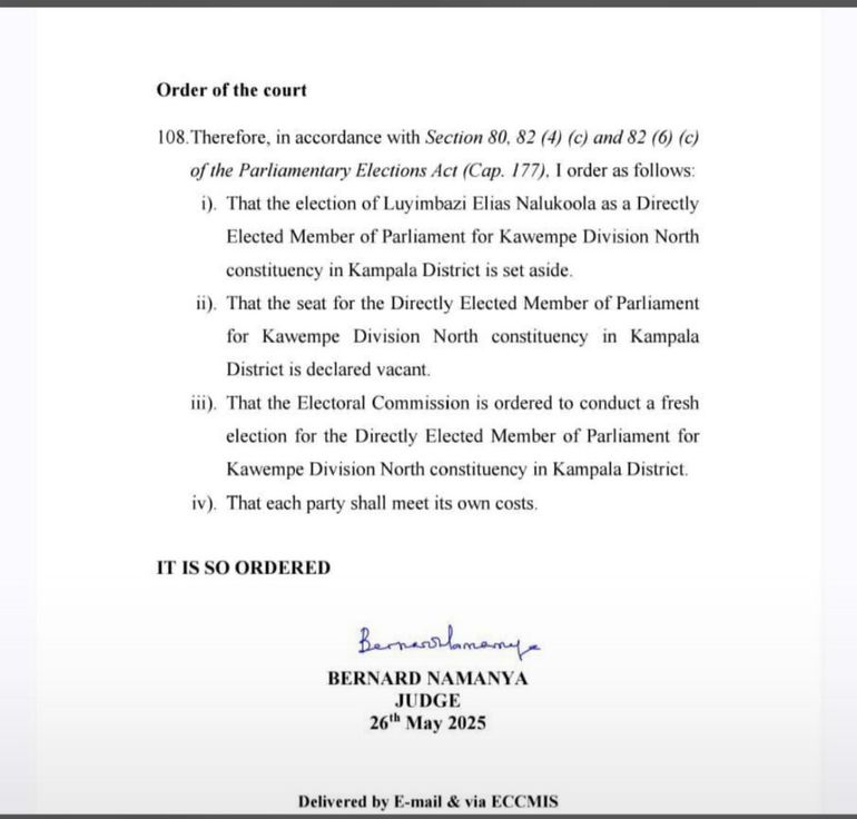 "This court has reached the decision to set aside the election of Luyimbazi Elias Nalukoola as a Member of Parliament for Kawempe Division North constituency for two main reasons"