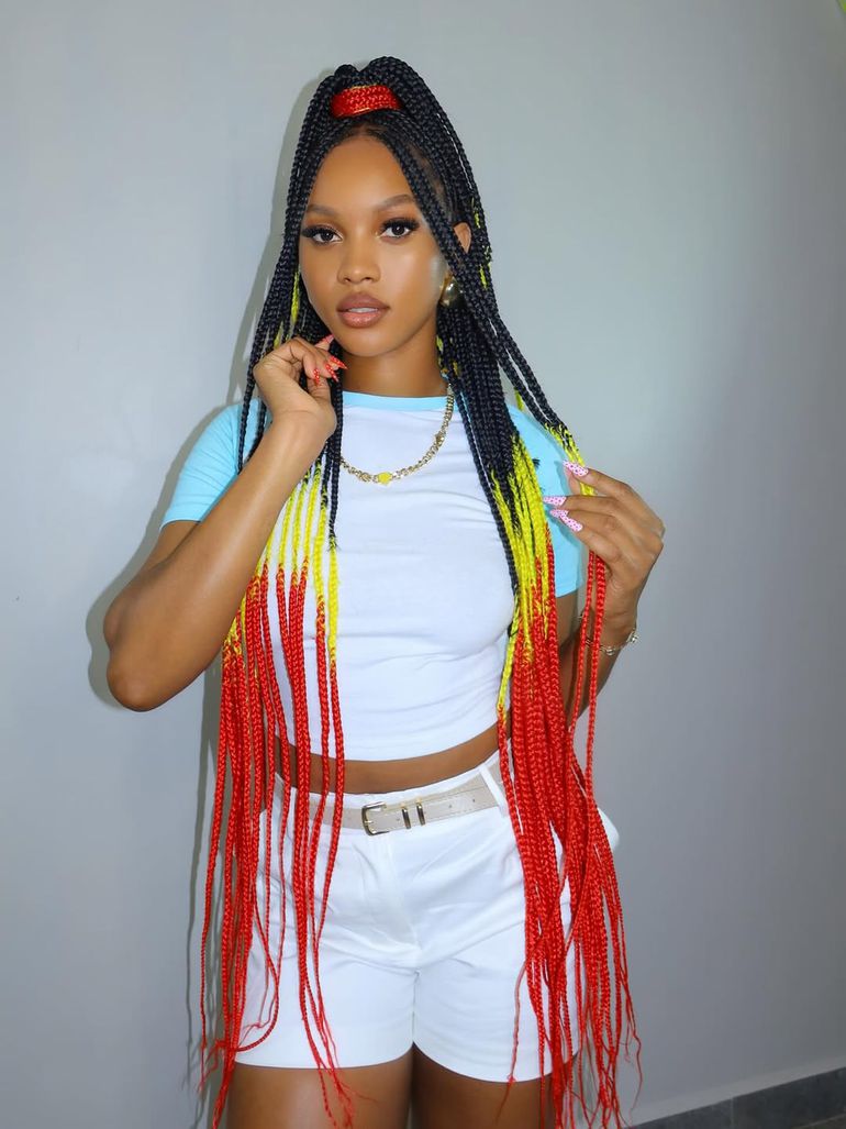 The songstress presented a modern, youthful look, featuring bright white shorts and a cropped top. Her hair braids were dramatically dipped in red and yellow dye, with a single red band holding them back.