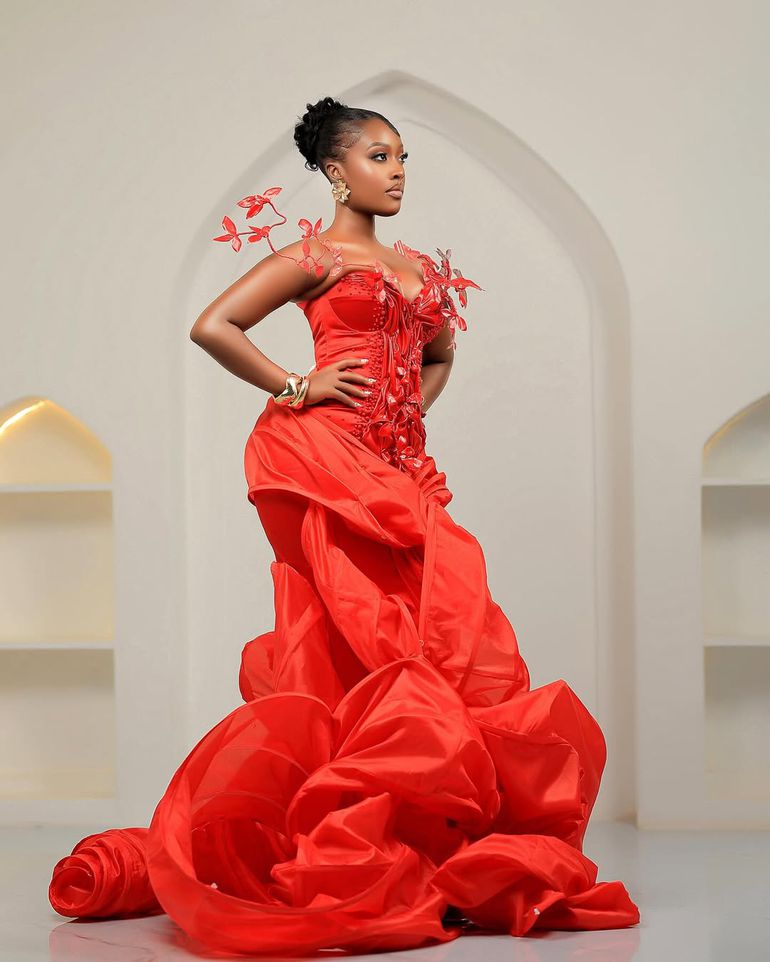 Leading the charge was the ever-glamorous Spice Diana, who looked breathtaking in a form-fitting red mini dress adorned with intricate beadwork and shimmering sequins, posing elegantly against deep red curtains.