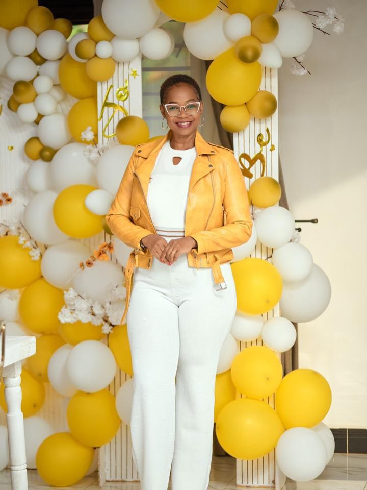 Ruth Kalibbala, another media personality, opted for a refreshing, sunny yellow leather jacket paired with crisp white flared trousers. Standing against a whimsical backdrop of gold and white balloons, her look was a cheerful and vibrant departure from the usual Valentine’s aesthetic.