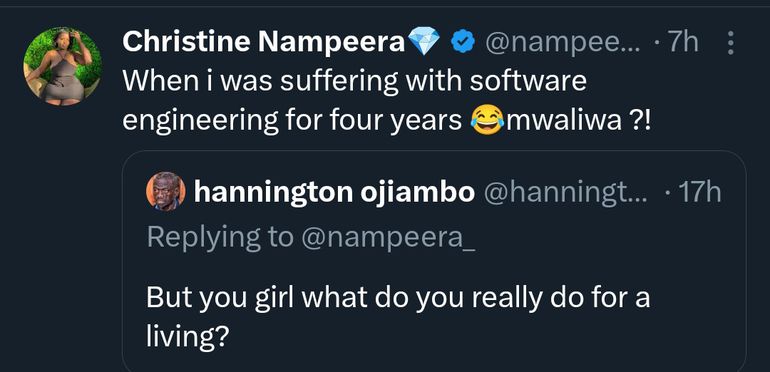 Nampeera responded: "When i was suffering with software engineering for four years 😂mwaliwa ?!"