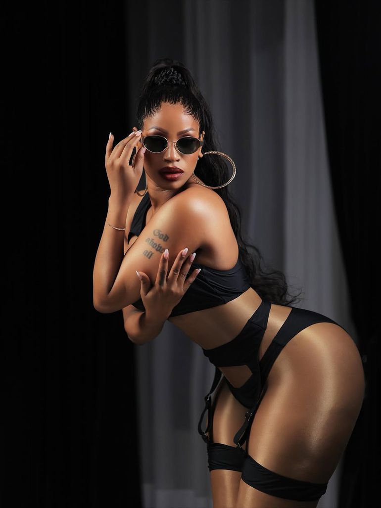 The images presented Sheebah in a bold, black two-piece lingerie-style set, featuring a daring one-shoulder top with a central cut-out and high-waisted bottoms complemented by dark garter straps descending her sculpted thighs.