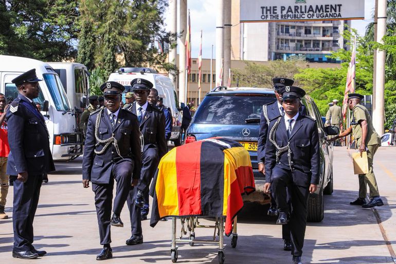 Standing on the entrances steps to receive the body was Speaker of Parliament Rt Hon Anita Among, her deputy Thomas Tayebwa, the Leader of Opposition, Joel Ssenyonyi, the parliamentary administration, ministers and scores of MPs.