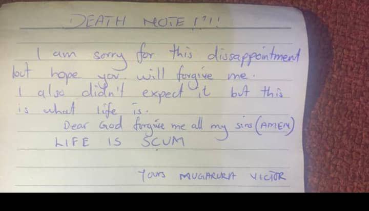 In his message, titled "DEATH NOTE!!!", he wrote, "I am sorry for this disappointment but hope you will forgive me. I also didn’t expect it, but this is what life is. Dear God, forgive me all my sins (AMEN). LIFE IS SCUM. Yours, MUGARURA VICTOR."