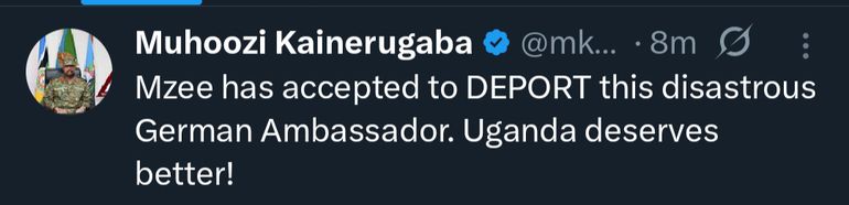 The CDF, who has been advocating for his deportation following the ambassador's unsavoury comments about him, posted on X: "Mzee has accepted to DEPORT this disastrous German Ambassador. Uganda deserves better!"