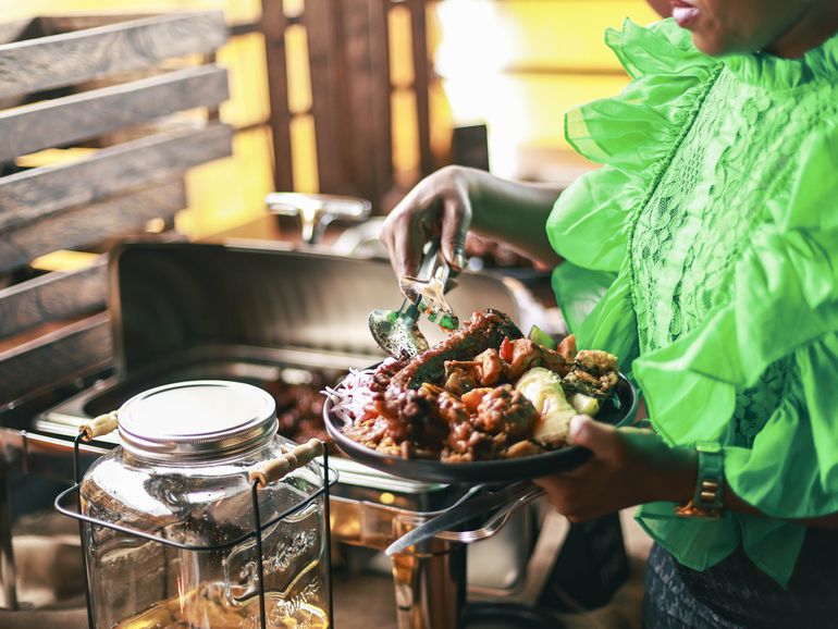 The mains featured vegetable rice, pilau, mashed Irish potatoes, and sauces like hearty beef goulash, alongside lamb sausages and sticky pork ribs.