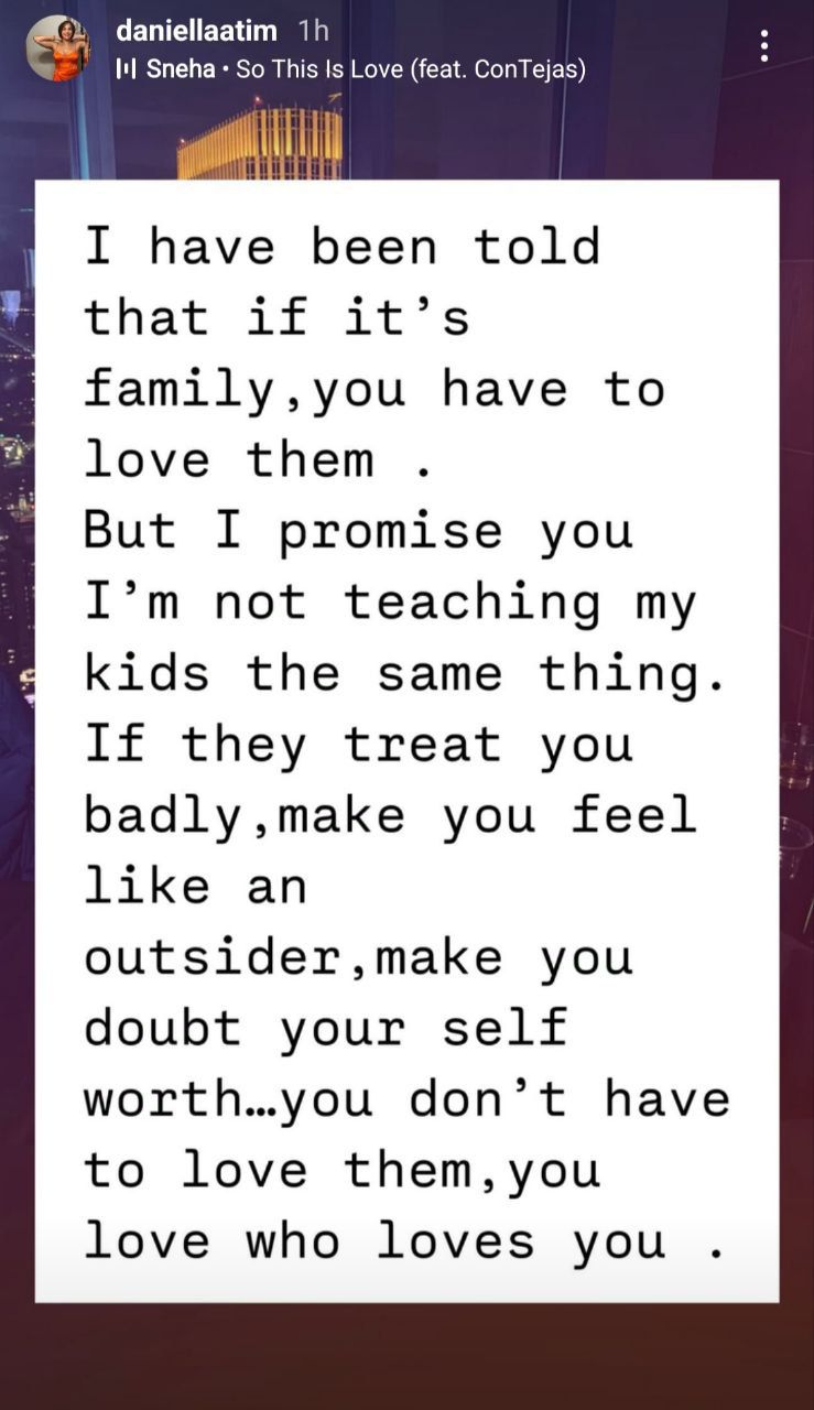 "I’ve often been told that if it’s family, you have to love them. But I assure you, I’m not teaching my kids the same thing," Atim, who shares five children with singer Jose Chameleone, wrote on her Instagram."If someone treats you poorly, makes you feel like an outsider, or causes you to doubt your self-worth, you are not obligated to love them. Love those who love you."